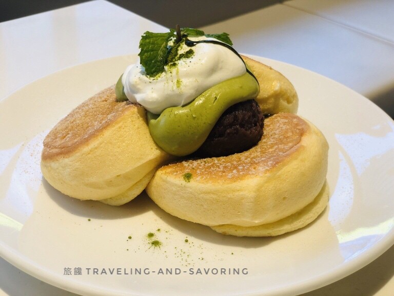 按照習慣,吃原味的總是最能感受食物最原始的模樣,所以我們點了 原味舒芙蕾鬆餅 一份。每份都有三片,搭配楓糖奶油醬,再點綴上一片綠綠的薄荷,一切配置完成!